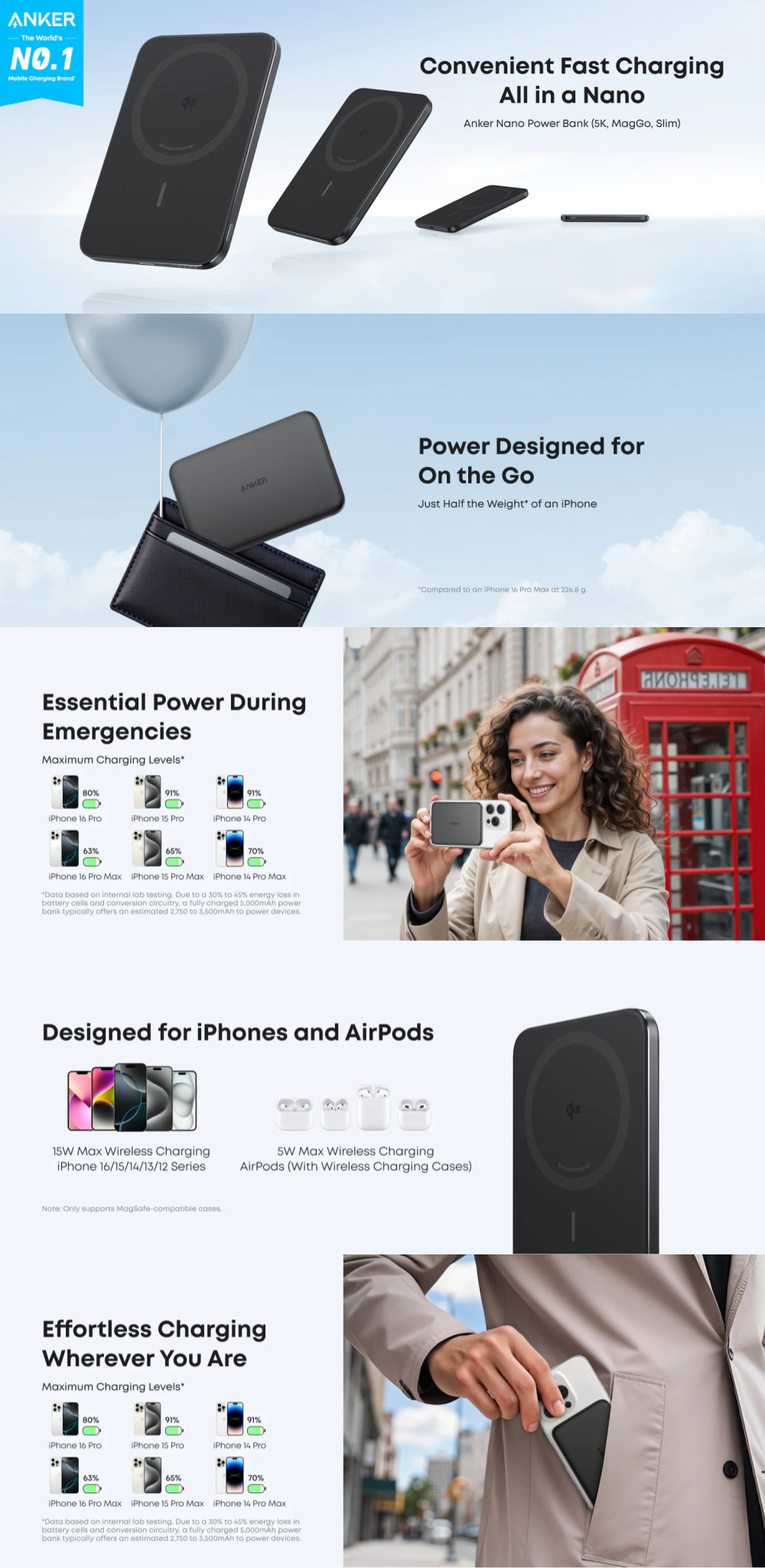 Cu incarcare rapida compatibila cu MagSafe de 15 W maxim, bateria externa Anker Nano ofera o eficienta ridicata pentru incarcarea mobila, alimentand rapid un iPhone 16 Pro pana la 25% in doar 42 de minute. (Date bazate pe teste interne de laborator; performanta reala de incarcare poate varia.)