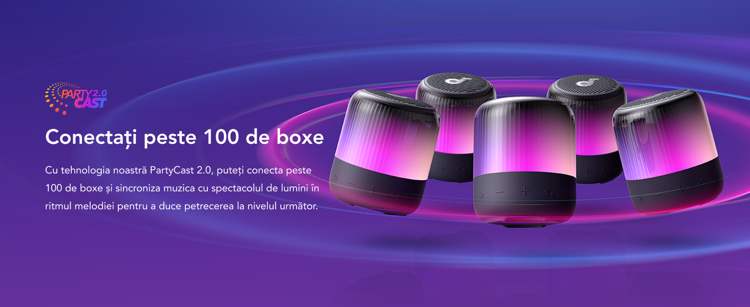 Conectati simultan peste 100 de difuzoare cu sunet si iluminare sincronizate pentru a simti cu adevarat atmosfera de petrecere.