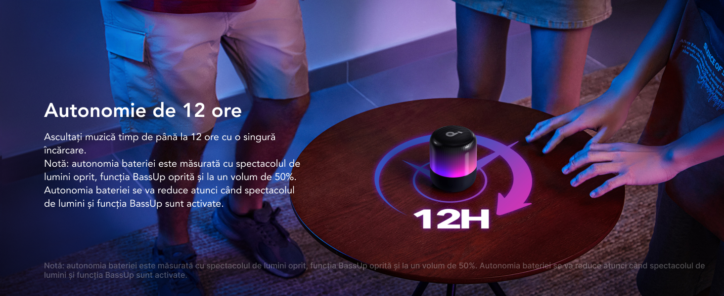 Ascultati muzica preferata timp de pana la 12 ore cu o singura incarcare. Nota: Durata de viata a bateriei va fi redusa la utilizarea efectelor de lumina.
