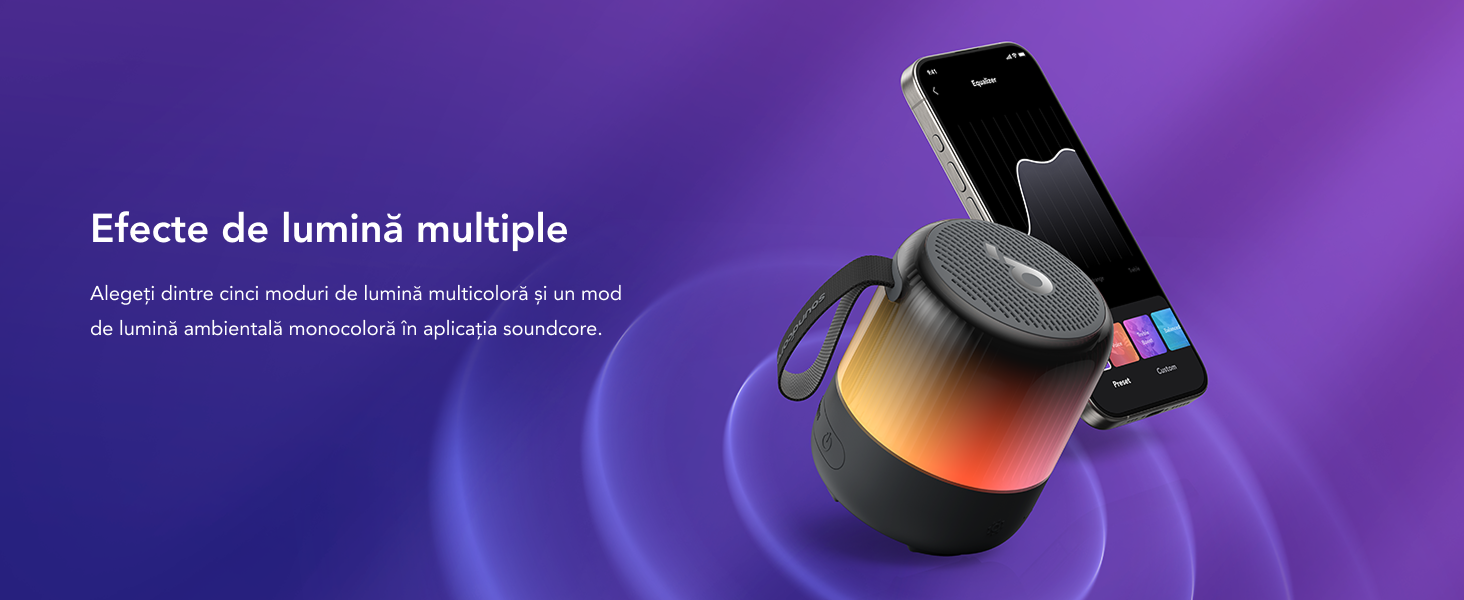 Boxa portabila Anker Soundcore Glow Mini, cu sunet360°, cu o putere totala de 8W si spectacol de lumini radiante sincronizat.