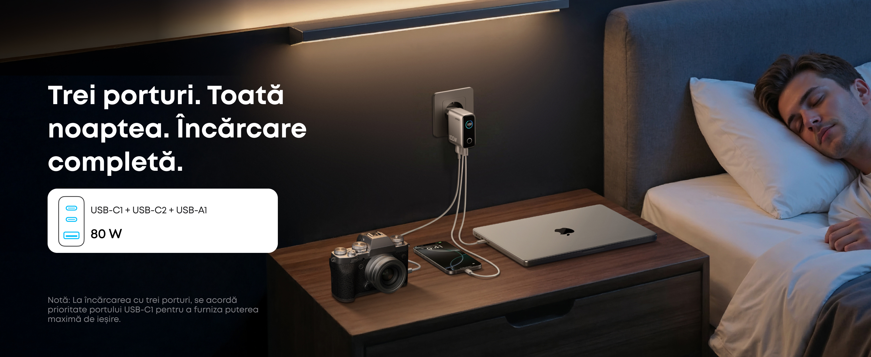 USB-C2 sau USB-A comuta automat in modul de curent redus de 95 W + 5 W atunci cand puterea de iesire ramane la sau sub 5 W timp de 1 minut, incarcand in siguranta castile si alte dispozitive cu consum redus de energie.