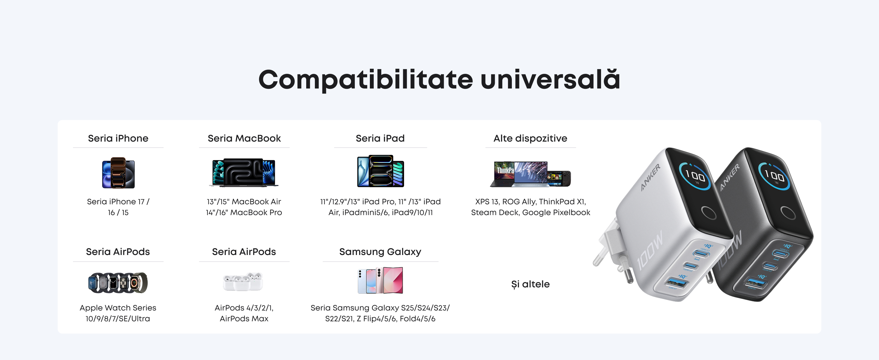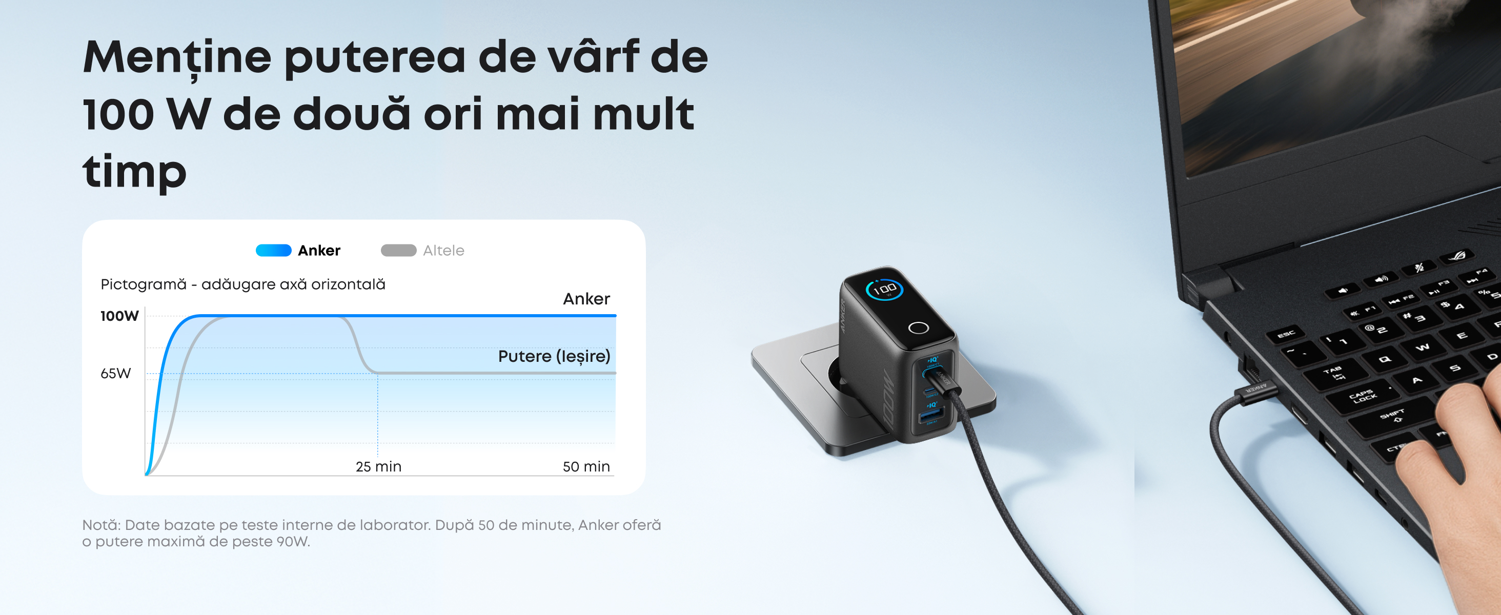 Tehnologia avansata GaN ofera o putere constanta de 100 W pe orice port USB-C si mentine performante maxime de pana la doua ori mai mult timp in comparatie cu un incarcator mediu de 100 W.