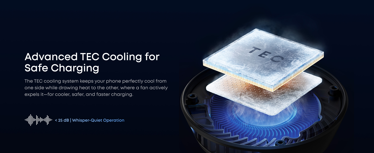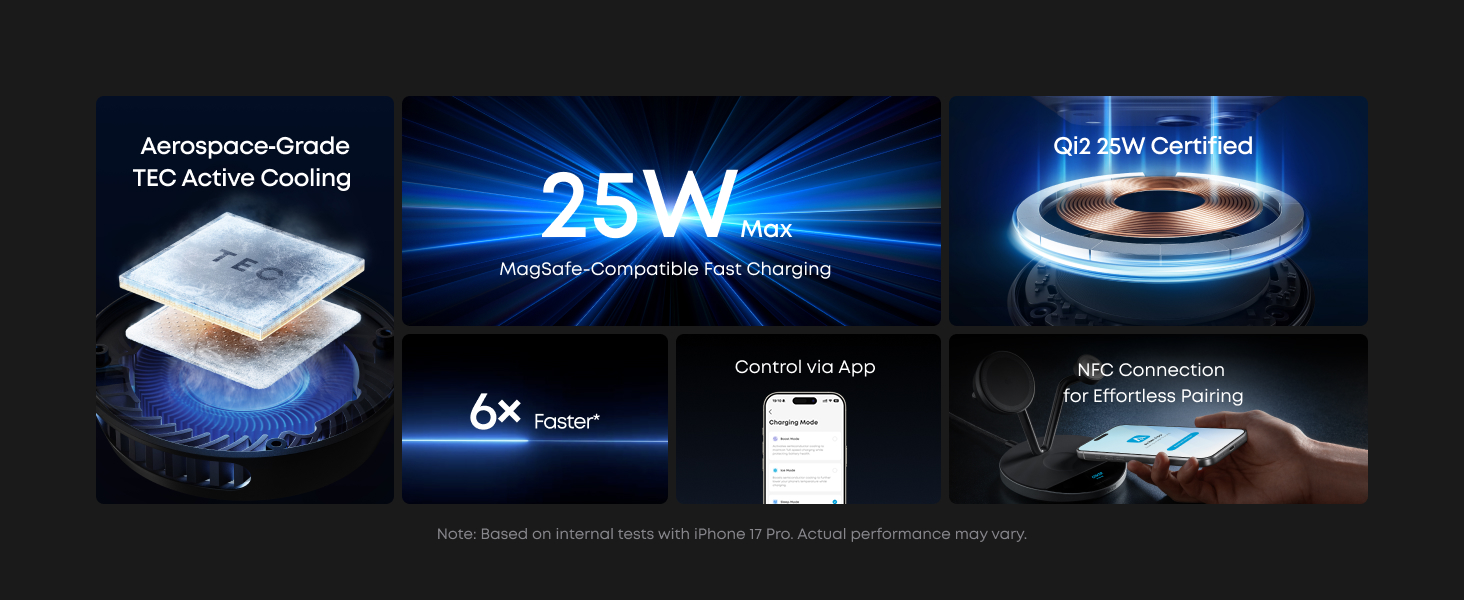 Incarcati-va iPhone 17 Pro pana la 50% in doar 22 de minute – depasind limitele incarcarii wireless standard de 25W cu racire activa TEC. Bucurati-va de viteza la nivel de fir cu confortul wireless, de pana la 6 ori mai rapid decat wireless de 5W. In timpul incarcarii si utilizarii, ramane rece si stabil – de pana la 4 ori mai rapid decat wireless de 5W. Performanta reala poate varia.