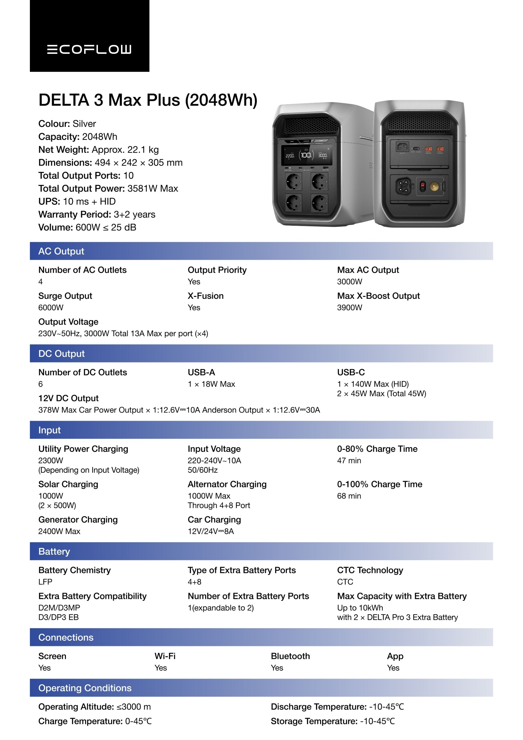 EcoFlow DELTA 3 Max Plus duce performanta la nivelul urmator, oferind 3000W putere AC (pana la 3900W cu X-Boost™) si aceeasi capacitate robusta de 2048Wh. Cu suport pentru expansiune pana la 10kWh si functii inteligente avansate, este solutia premium pentru alimentare de urgenta, off-grid sau utilizare profesionala.