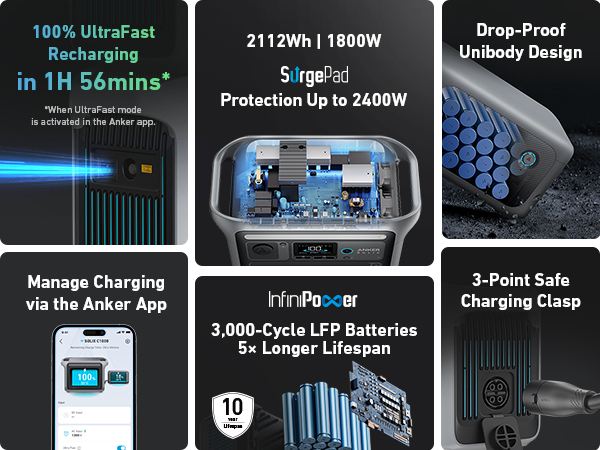 Tehnologia SurgePad de la Anker SOLIX C1000X ofera o iesire masiva de 2400 W, permitand alimentarea a 99% dintre aparate prin 9 porturi versatile, oferind compatibilitate si capacitate de neegalat pentru RV-uri si camping in aer liber.